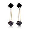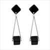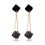 Noir et or offrent une élégance moderne à cette boucle d'oreille fantaisie unique pour sublimer une tenue de soirée. Longue et pendante, ce bijou joue de formes géométriques fines et design alliant losanges et chainettes en or pour apporter la touche luxueuse finale à la tenue féminine.  Disponible en coloris or ou argent, elle s'attache facilement au lobe grâce à son fermoir papillon