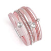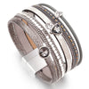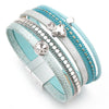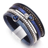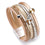 Monté en semainier, ce magnifique bracelet en cuir possède des décorations luxueuses d'or, d'argent et de pierres précieuses idéales pour sublimer une robe de soirée ou tenue chic. Son fermoir aimanté rend pratique de l'attacher, il suffit de joindre les deux extrémités pour clipser le tour au poignet.