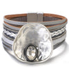 Coquillage nacré et semainier en cuir ornent magnifiquement cet imposant bracelet fantaisie dont la touche finale est apportée par le diamant brillant taillé sur le devant. Tressage, cuir brut et motifs saccadés s'entremêlent pour créer un véritable bijou féminin à porter pour sublimer une tenue. Le fermoir magnétique permet d'accessoiriser ce gros bracelet rapidement au poignet ou autour du bras.
